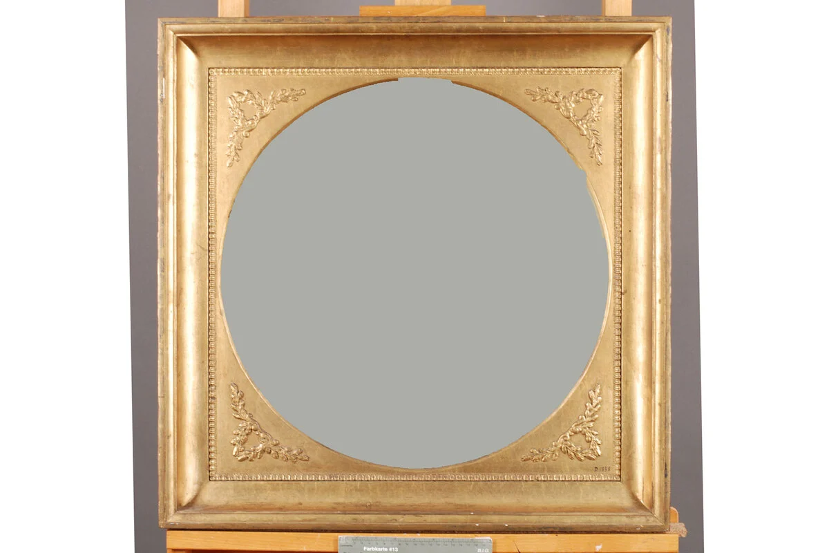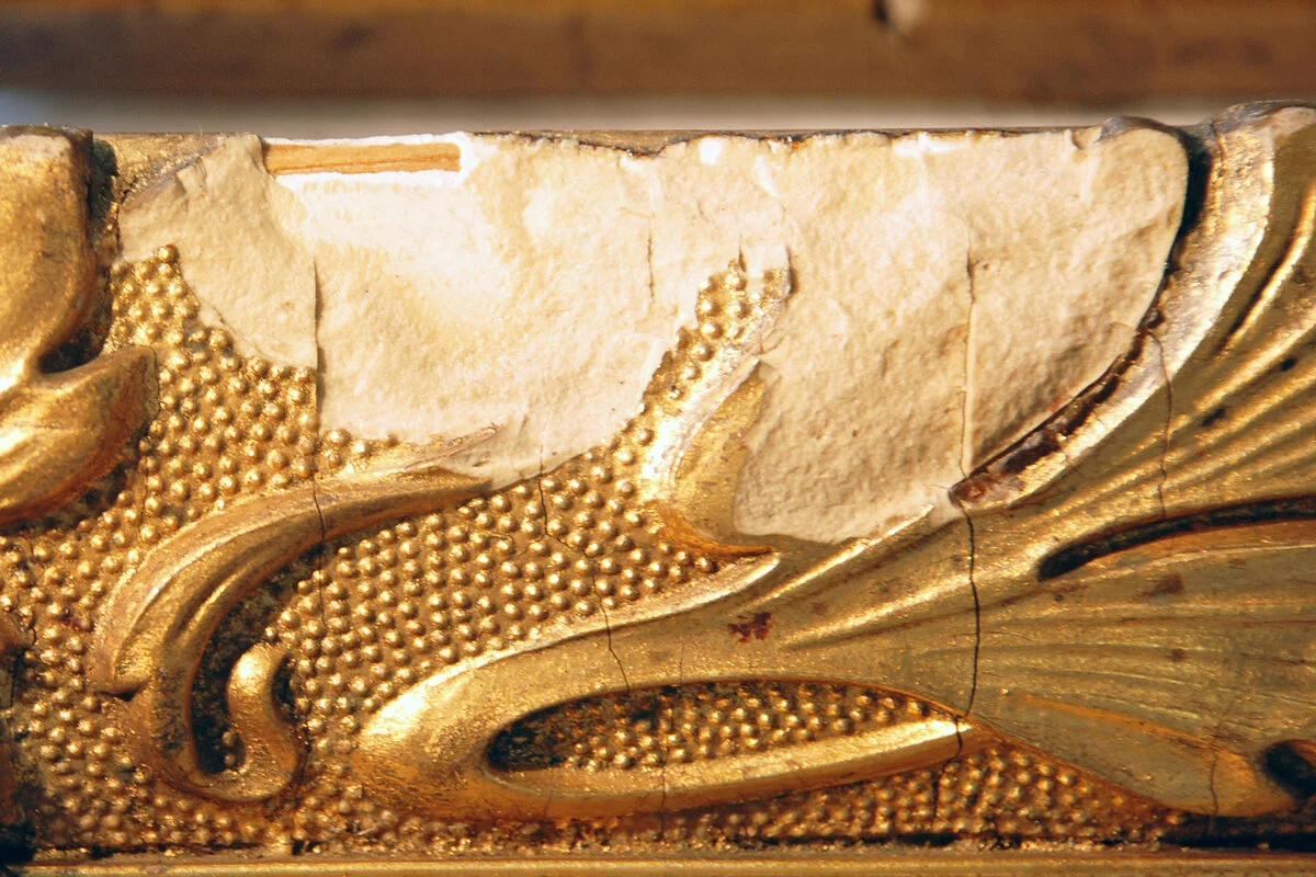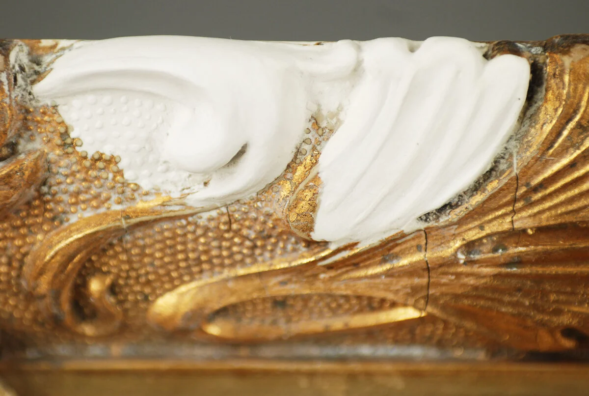 Bei der Restaurierung von Zierrahmen führen wir häufig ästhetische und stabilisierende Maßnahmen durch. Zum Einen soll hierdurch das ästhetische Erscheinungsbild verbessert werden, zum Anderen sollen sie gewährleisten, dass die Funktion eines Zierrahmens als zierende und schützende Umrahmung, die eine konservatorisch sachgerechte Präsentation und Hängung des Werkes ermöglicht, wiederhergestellt wird. die künftig sichere , wie die Neuverleimung geöffneter und instabiler Gehrungen, durch. Schmutzabnahmen, Ergänzen von fehlenden Stuckelementen durch Kittung und Retusche, Festigung von Fassungslockerungen und Eintönen von Bereibungen gehören ebenfalls zu regelmäßigen Restaurierungsarbeiten.