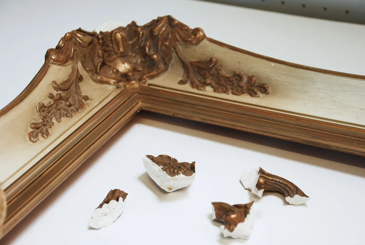 Zierrahmen werden im Laufe der Zeit oft stark beansprucht und weisen unter anderem Bestoßungen - besonders an den Ecken -, Verschmutzungen, Fassungsverluste und Lockerungen, fehlende Stuckelemente und Verfärbungen auf. Oft sind auch die Gehrungen geöffnet und die Zierrahmen konstruktiv nicht mehr stabil.